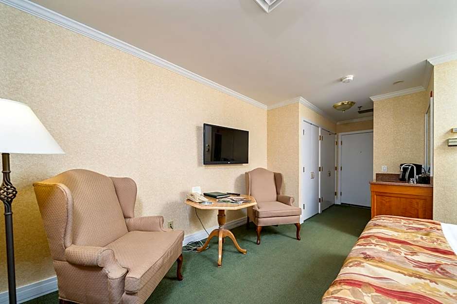 This room features a Keurig coffee machine, spa bathrobes, and a seating area.